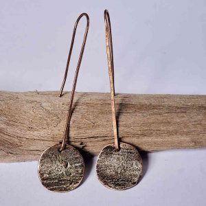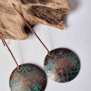 - Hammered Copper Patina Earrings Suspended on long ear wires made of pure copper. Hand-textured copper disc earrings compliment any outfit or occasion.