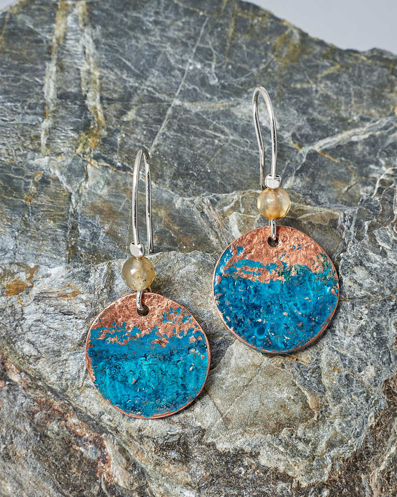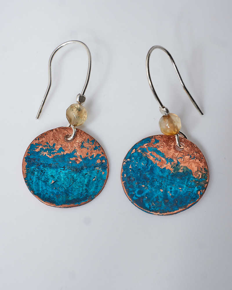 - Ocean Copper Patina Earrings Copper earrings suspended on silver ear wires ,decorated with a small faceted agate. One of a kind earrings. Hand-textured copper disc earrings compliment any outfit…