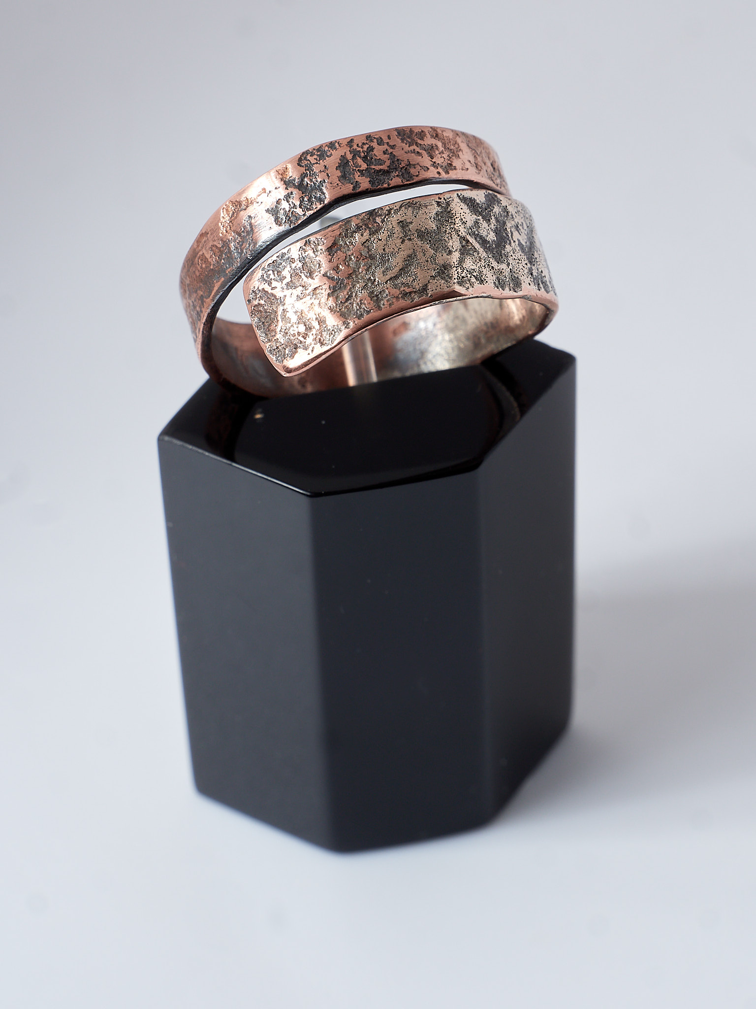 - Copper and Silver Rustic Wood Ring Ring handmade of copper and stylised with a rustic wood effect. Textured by hand using manual tools, decorated with silver and patinated. For…