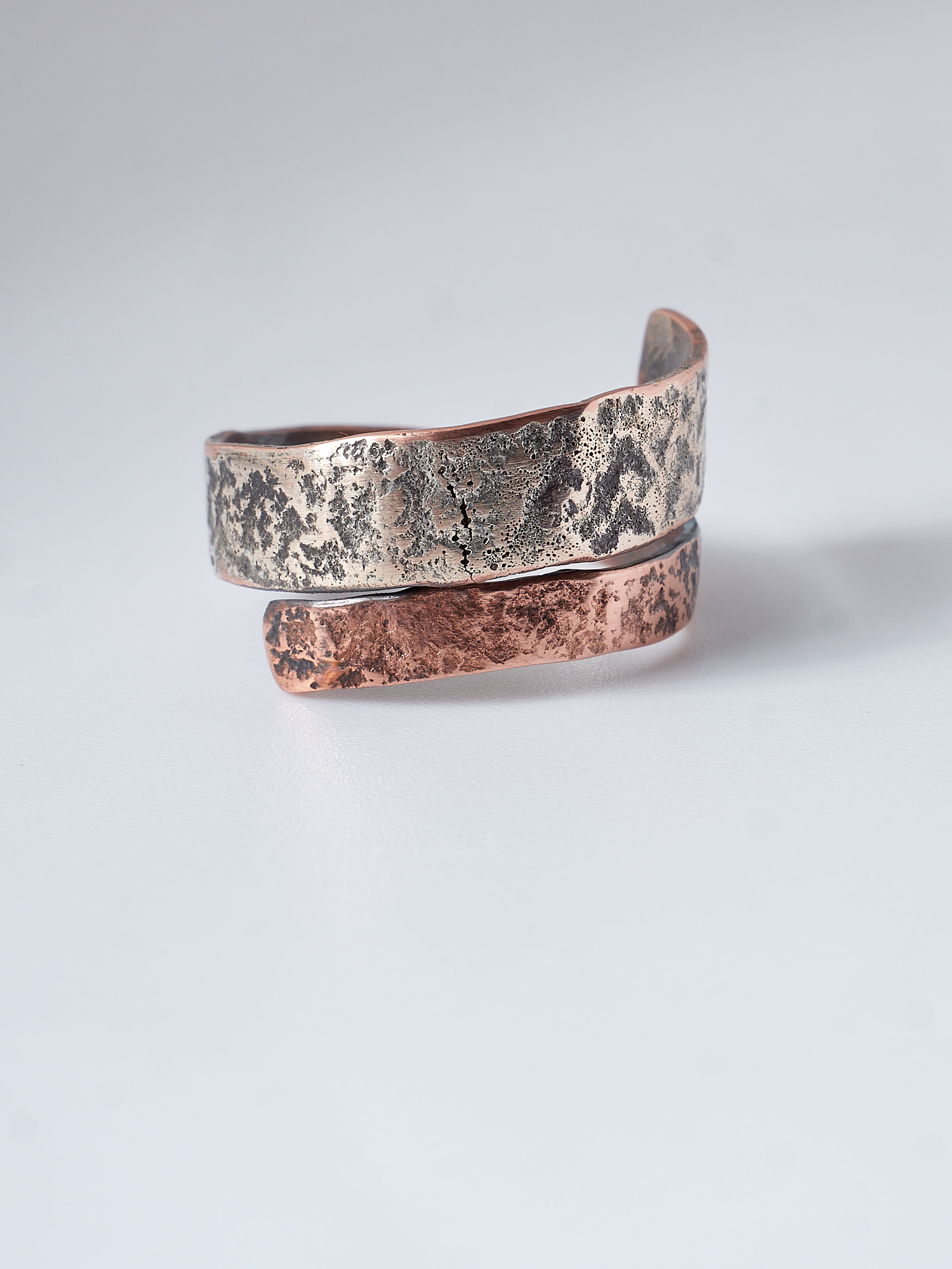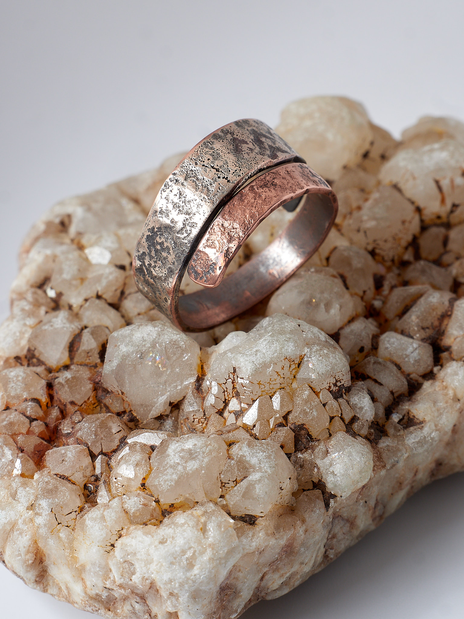 - Organic Copper-Silver Adjustable Ring A handcrafted ring made from pure copper and silver. Hand formed, hammered, and patinated. Created in one copy with a unique motif of raw organic…