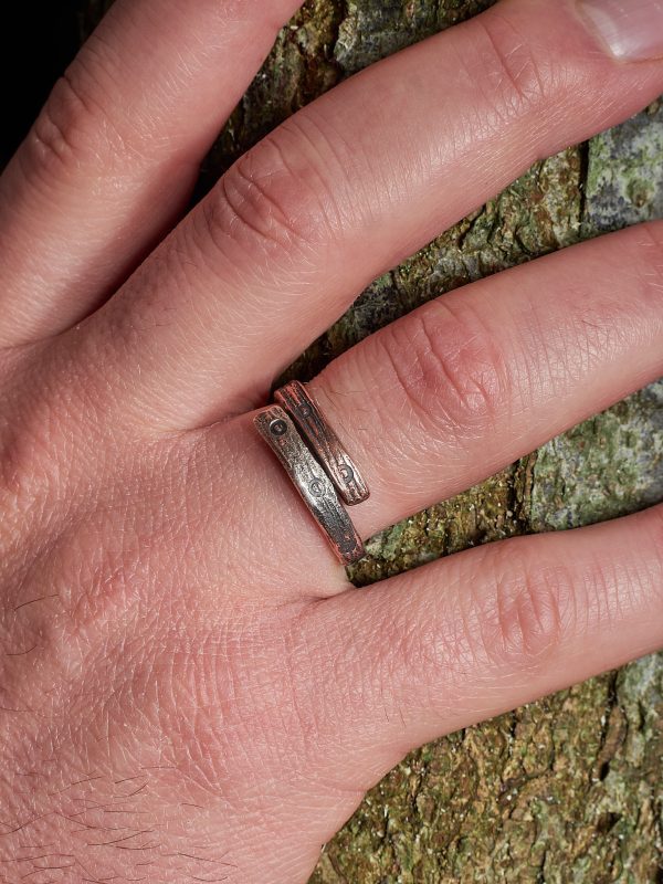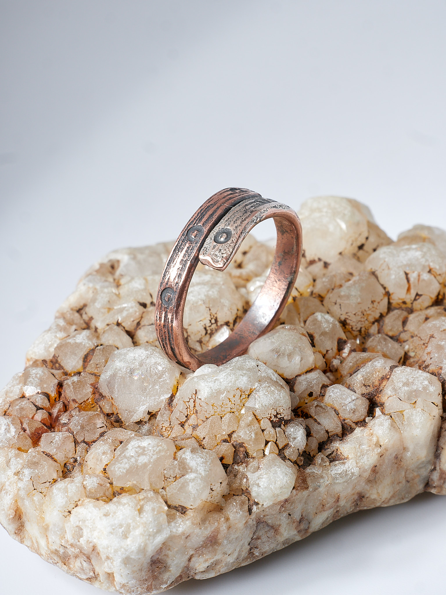 A handcrafted ring made by hand from pure copper and silver. Hand formed and hammered.