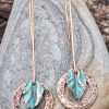 Handcrafted unique and delicate earrings made of copper circles and patina copper leaves hung on long hand made ear wire.