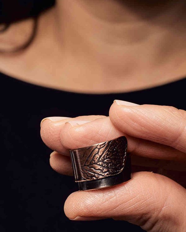 Luxurious Copper Leaf Motif Ring – a unique piece of handmade jewellery inspired by nature. Carefully handcrafted in Ireland by Edyta Rosinska from high-quality pure copper.