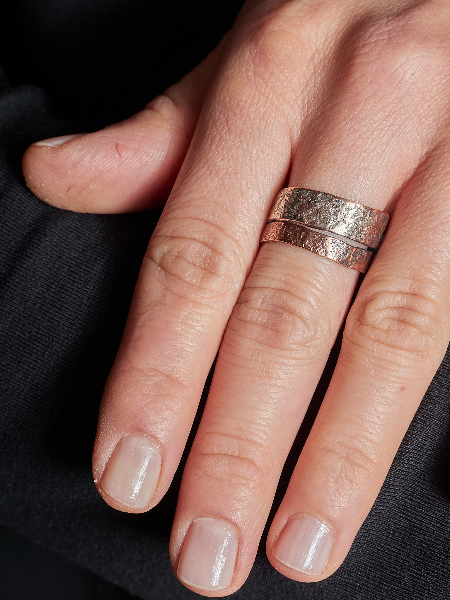 For each of our copper rings, I include a small cleaning cloth so that you can polish up your ring when it begins to darken naturally. The inside of these rings is protected with a metal varnish to prevent the natural copper from staining the skin. Note: If you do not wish for the inside of your ring to be varnished, please let me know in the comments field when you submit your purchase.