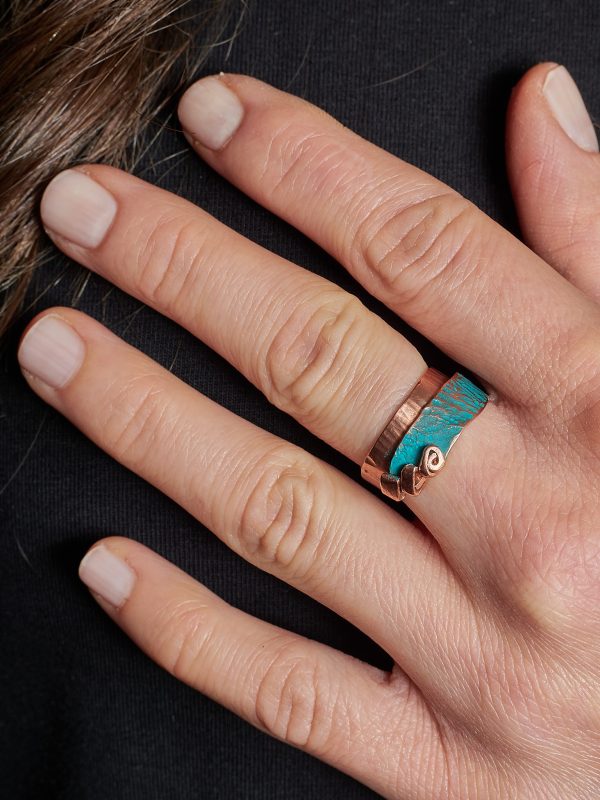 The ring is handmade from scratch in pure copper and decorated with a turquoise patina.